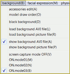 The Background Tab in MMD.Whatever you want displayed on your KeyScreen needs to be in an .avi file type. If your video has sound it will not play; so all of the audio will have to be recorded in the main .wav file. To load your footage go the main menu’s background tab and select load background AVI file. Return to the background tab and check the ON.mode03(B) option.  If you press play the background avi will be playing while your motion data is running.